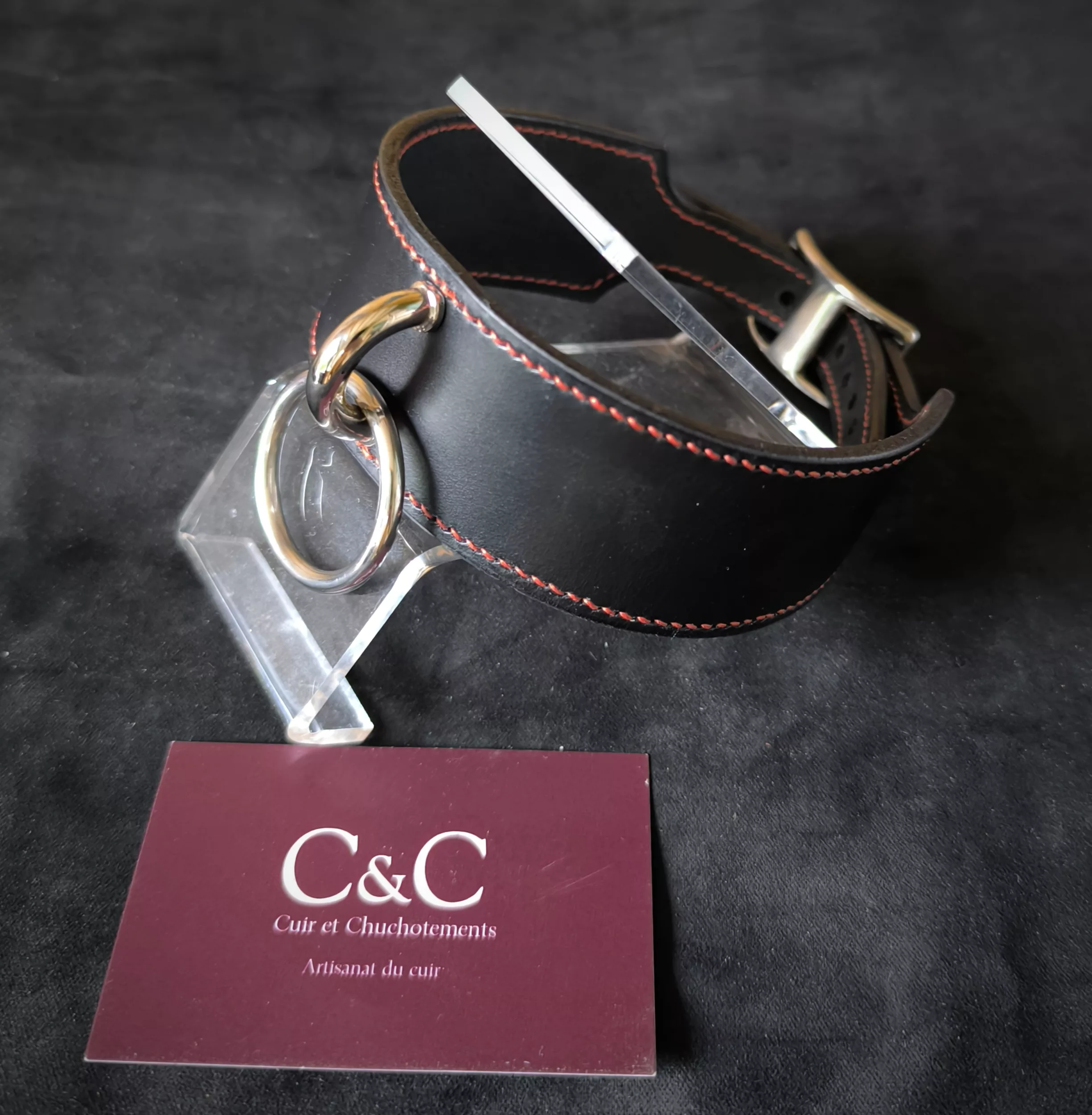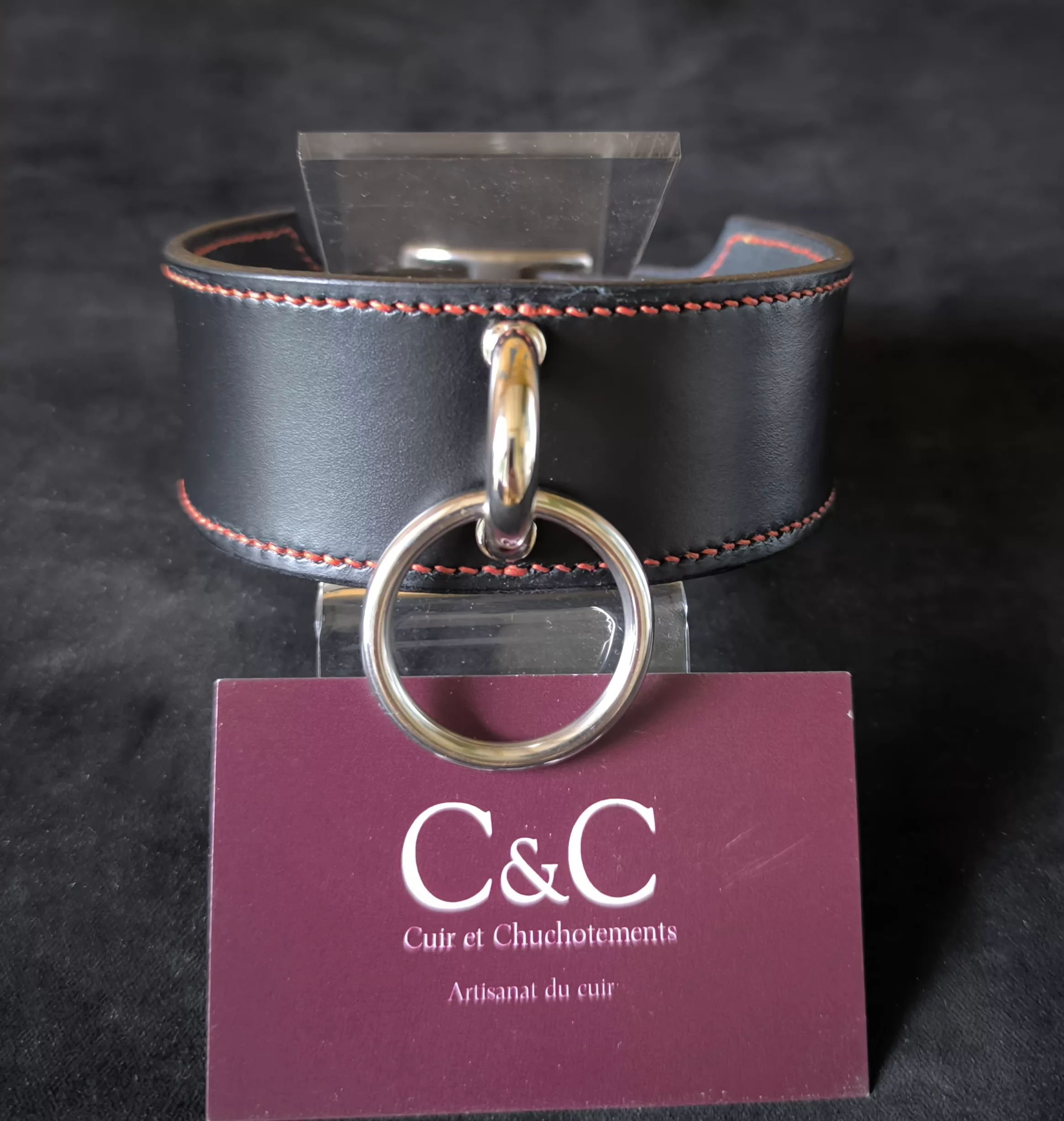 Collier noir 40 mm de large en cuir tanné végétal (Italie) et couture au fil de lin couleur cuivre