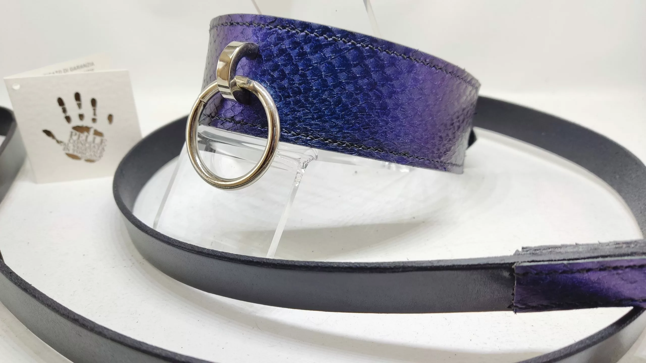 Black vegetable tanned leather, and blue/violet salmon vegetable tanned leather