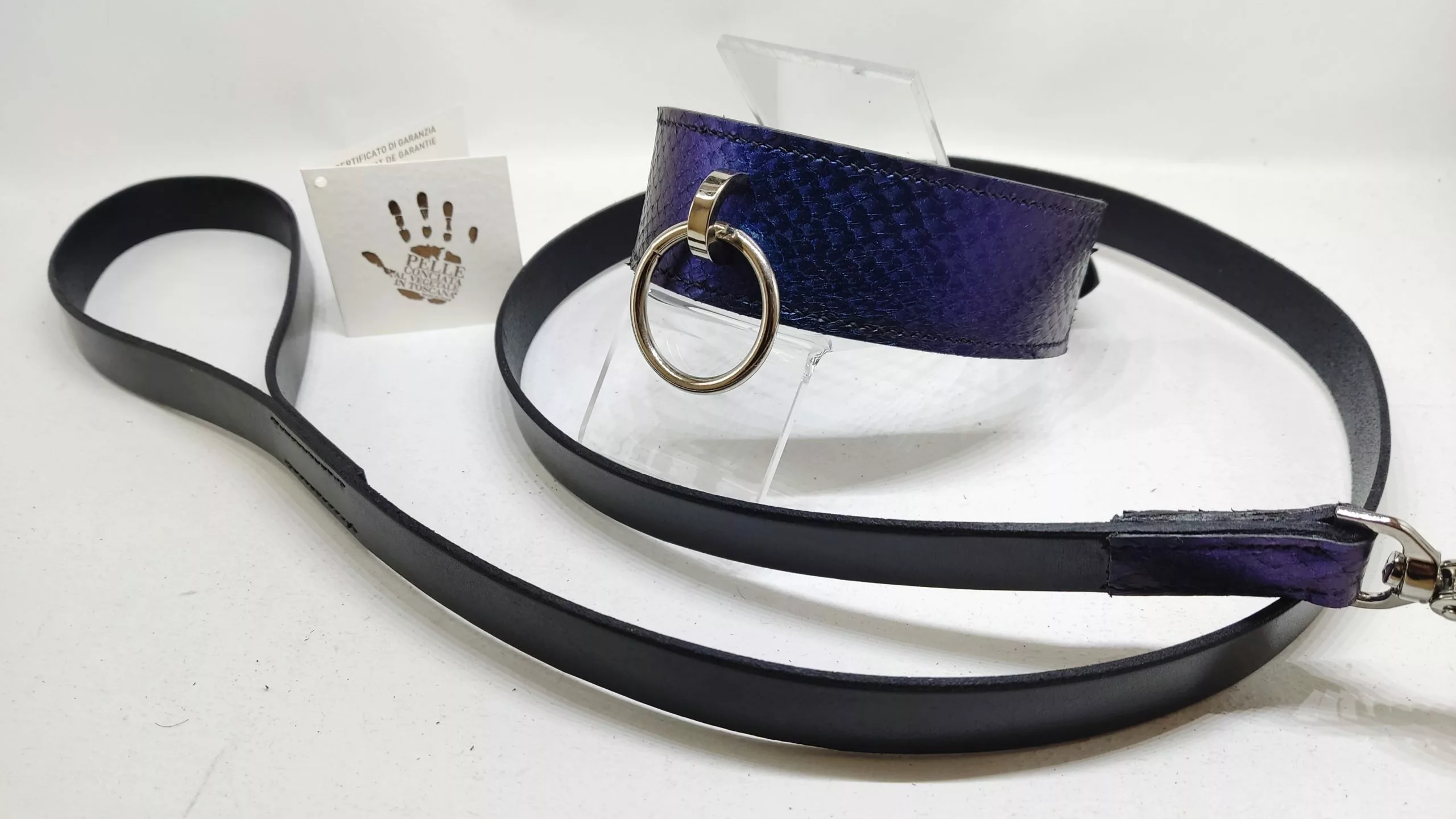 Ensemble de la gamme « Thétys » en cuir noir tanné végétal (Italie) et cuir de saumon tanné végétal (France), irisé, il change de couleur selon la lumière, du bleu au violet!