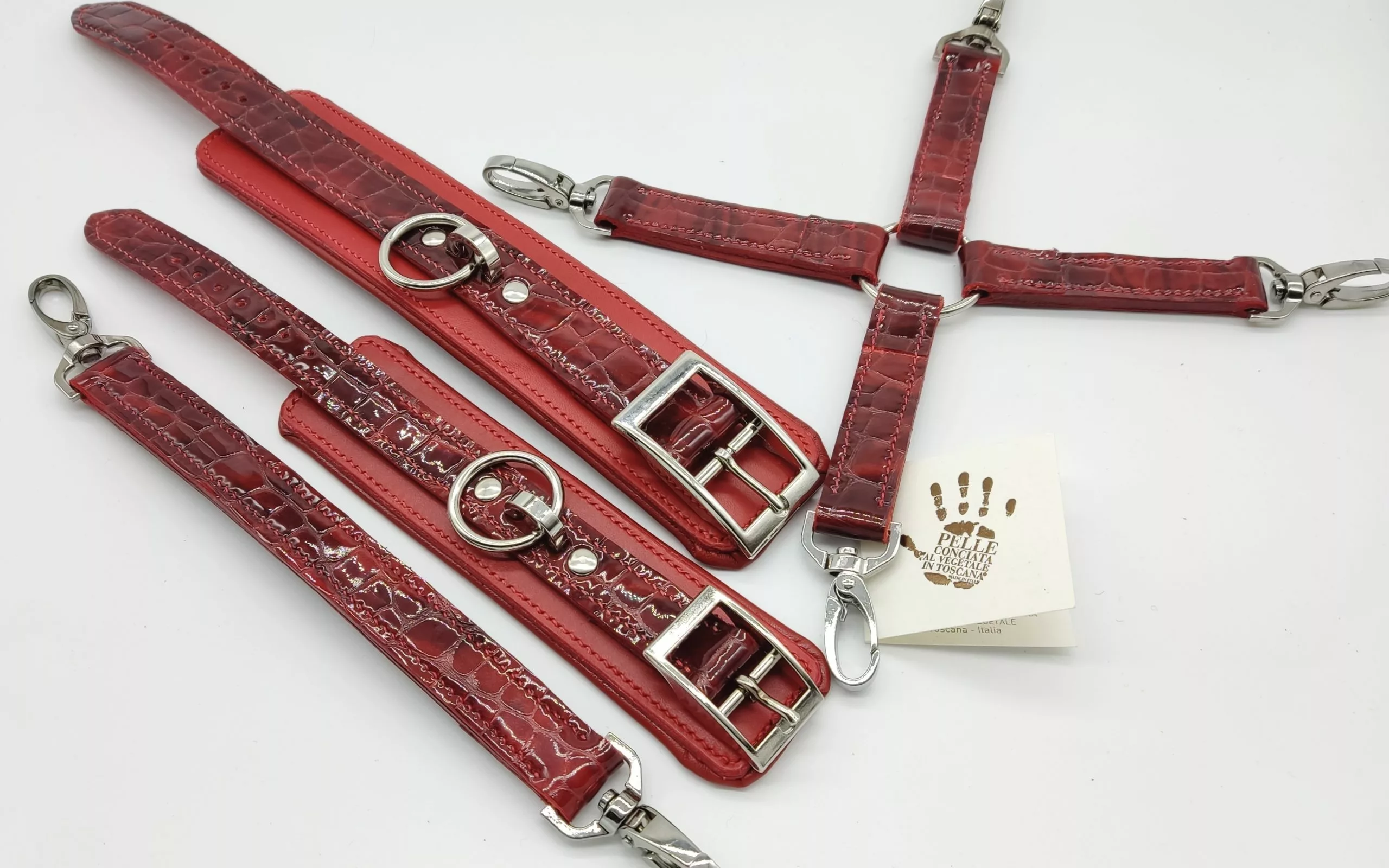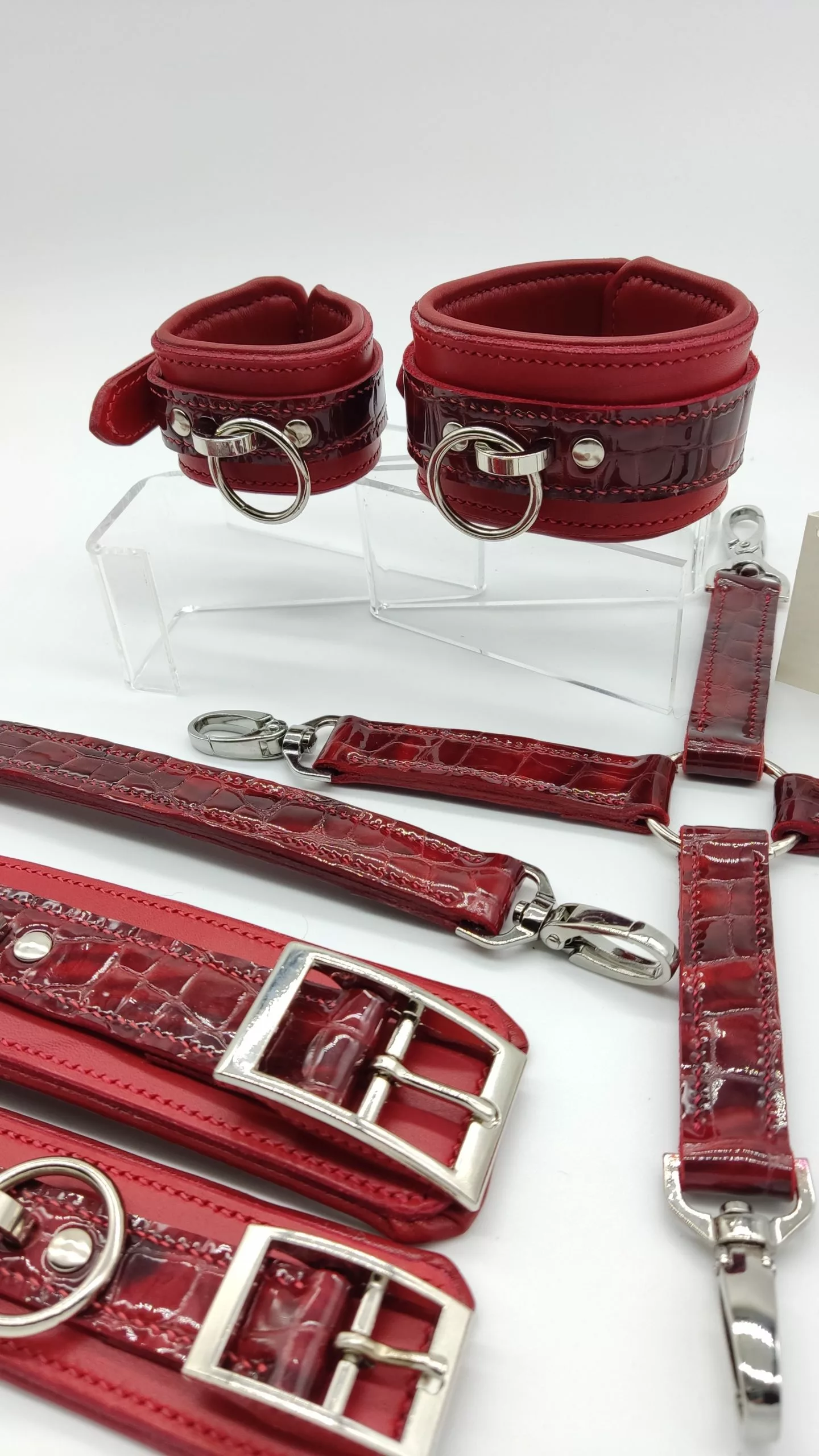 Bdsm red vegetable tanned leather and red patent leather set, handcuffs + anklecuffs + links