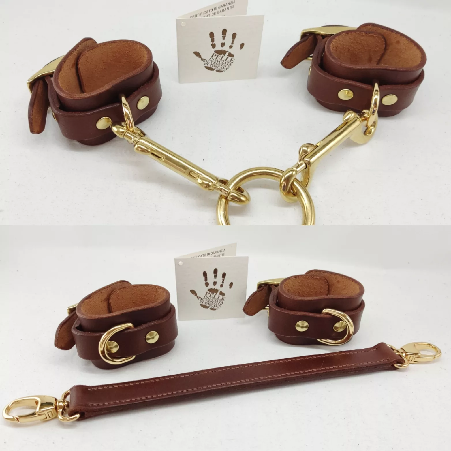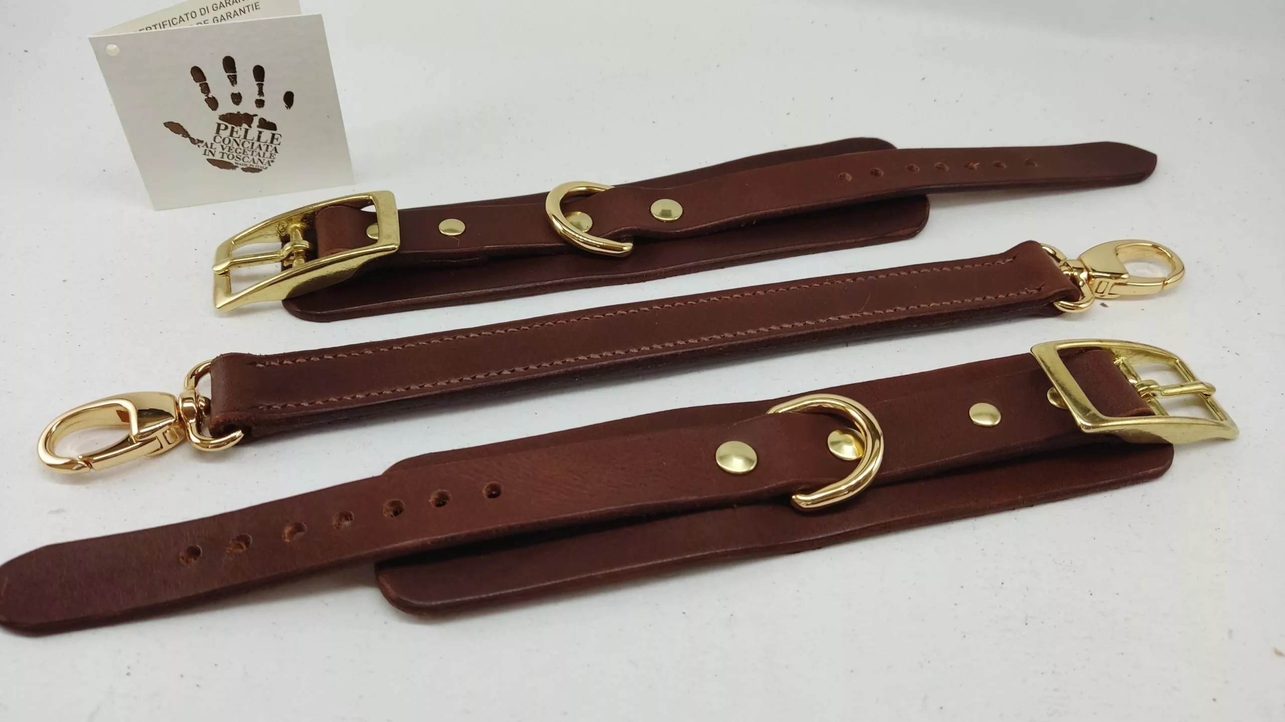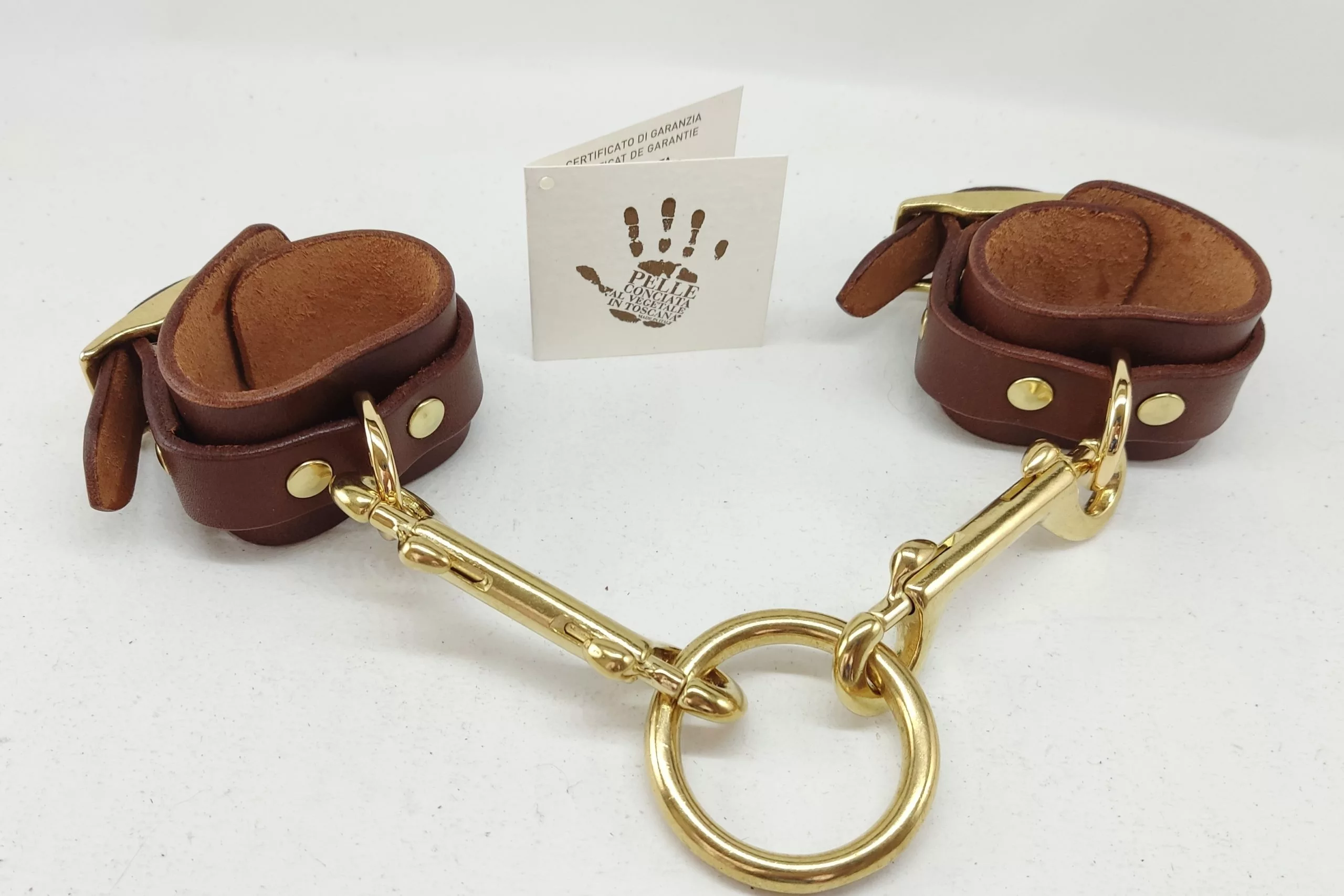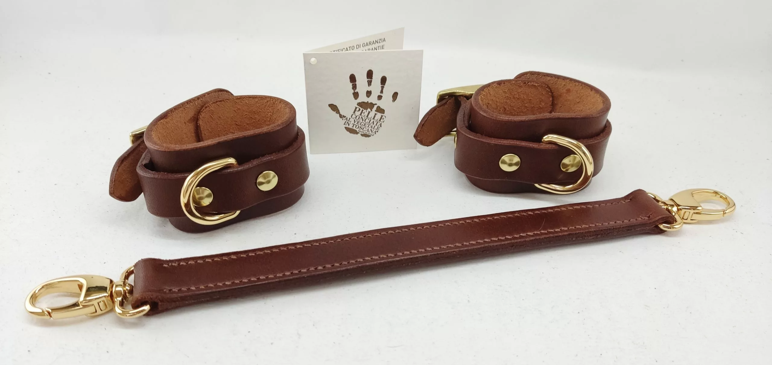 Menottes et liens de chevilles en cuir tanné végétal couleur « noisette », cuir souple