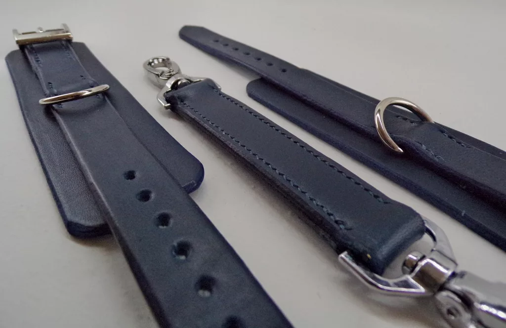 Paire de menottes en cuir bleu tanné végétal (tannerie Walpier, Italie)
